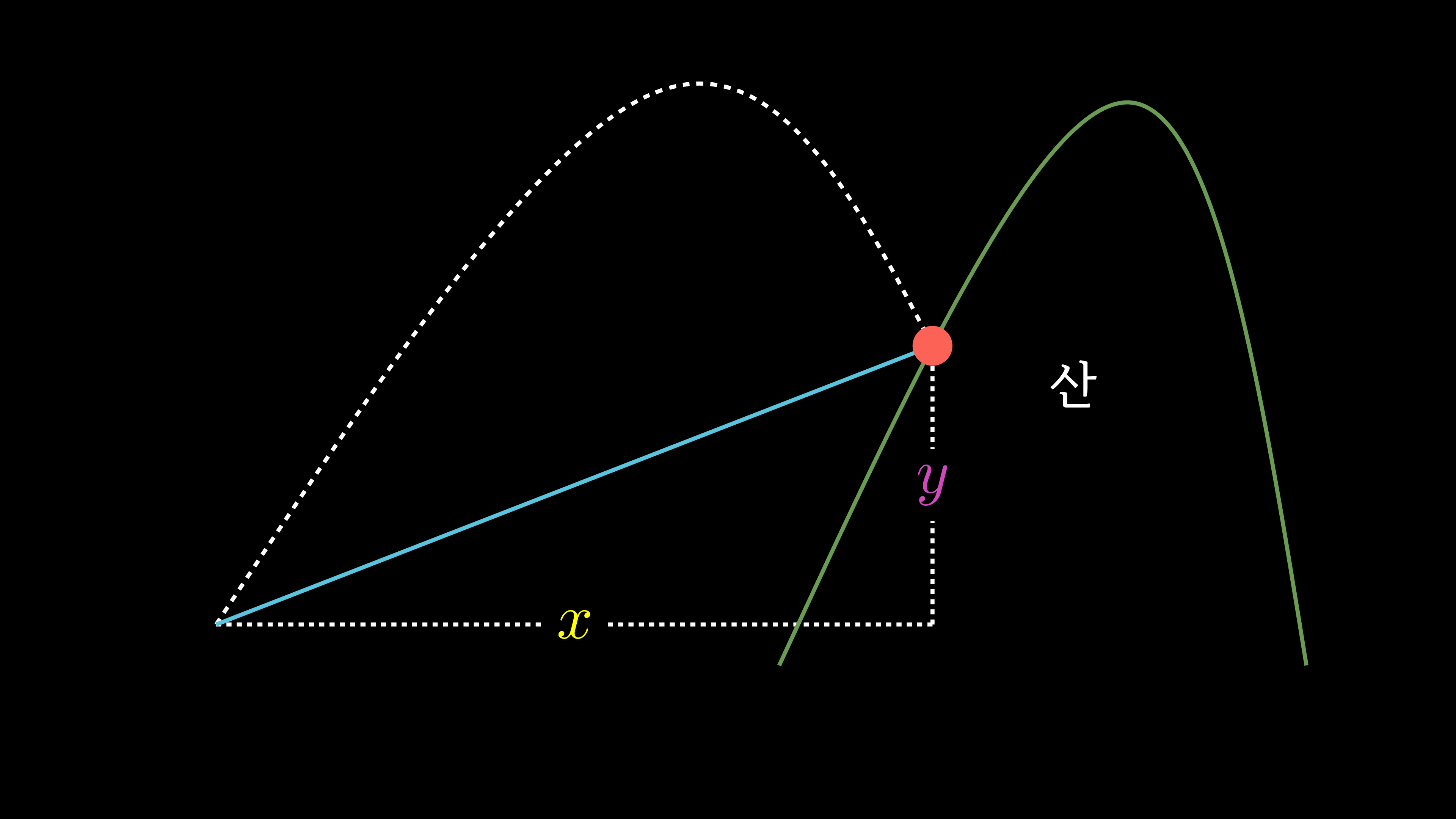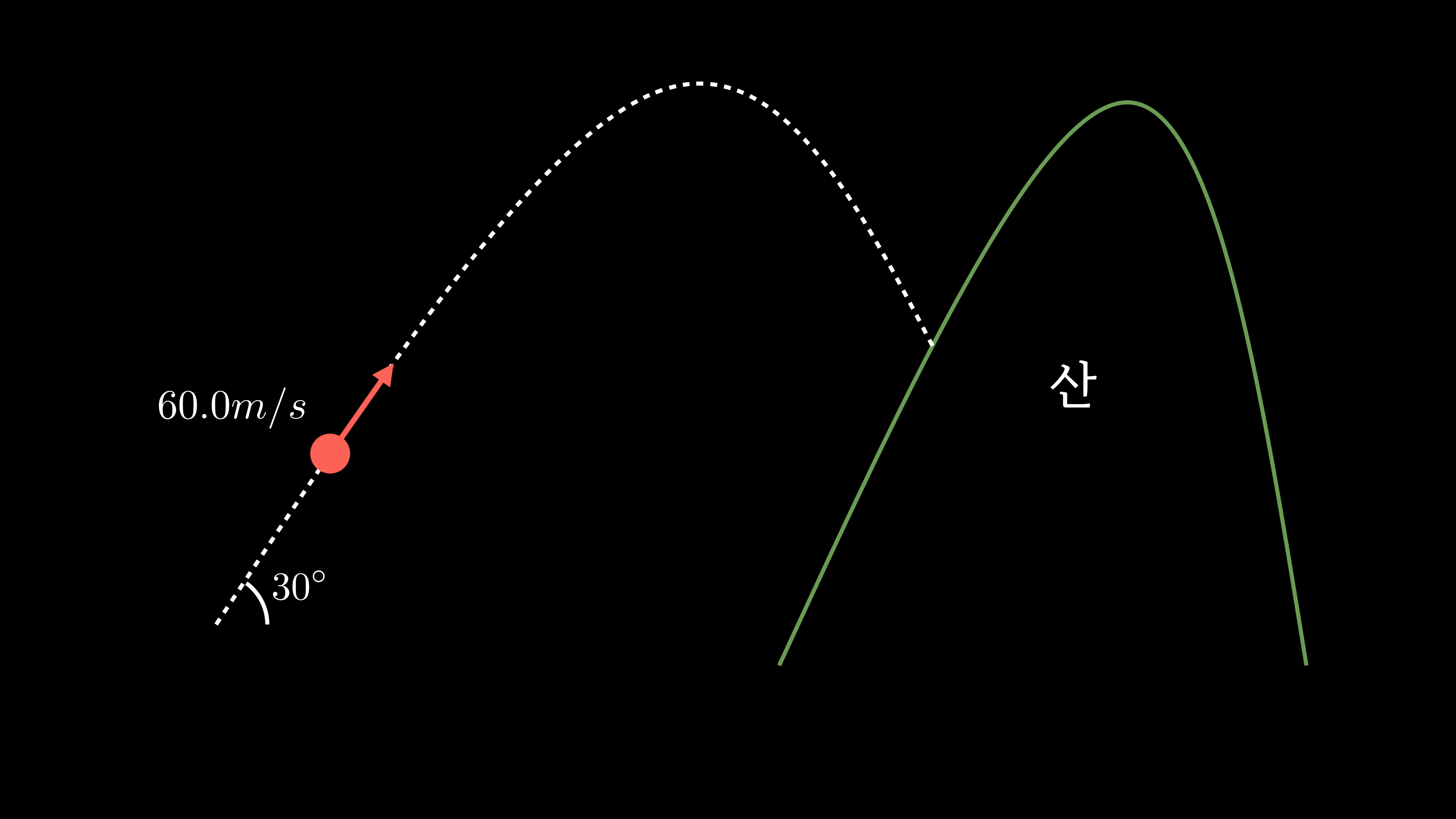 발사된 포물체가 4초 뒤에 산중턱에 정지한 상황입니다.