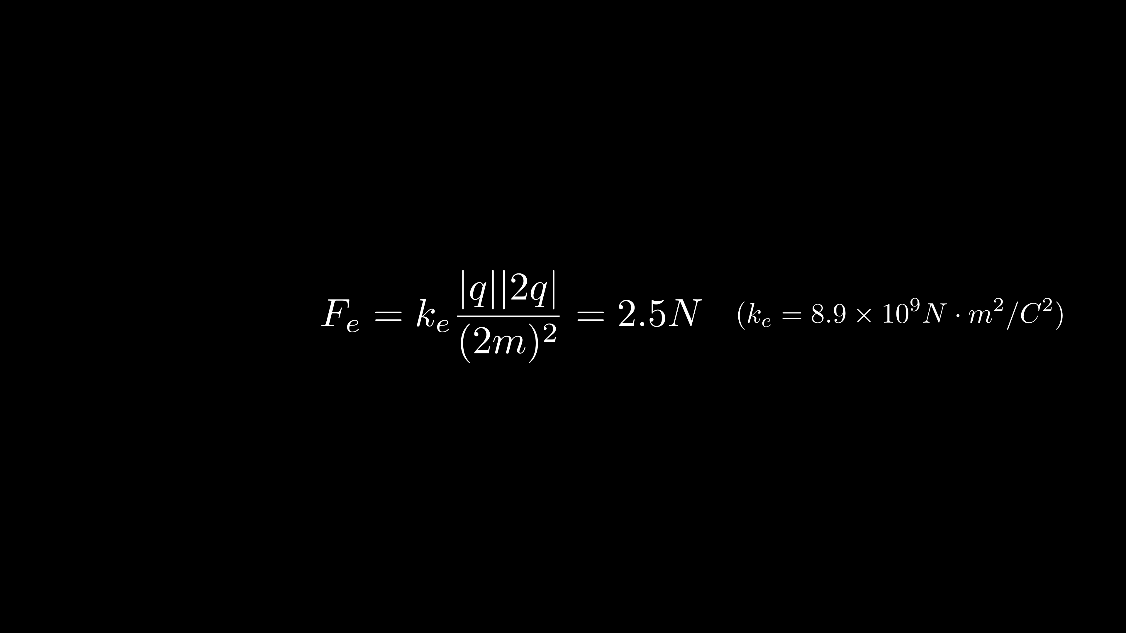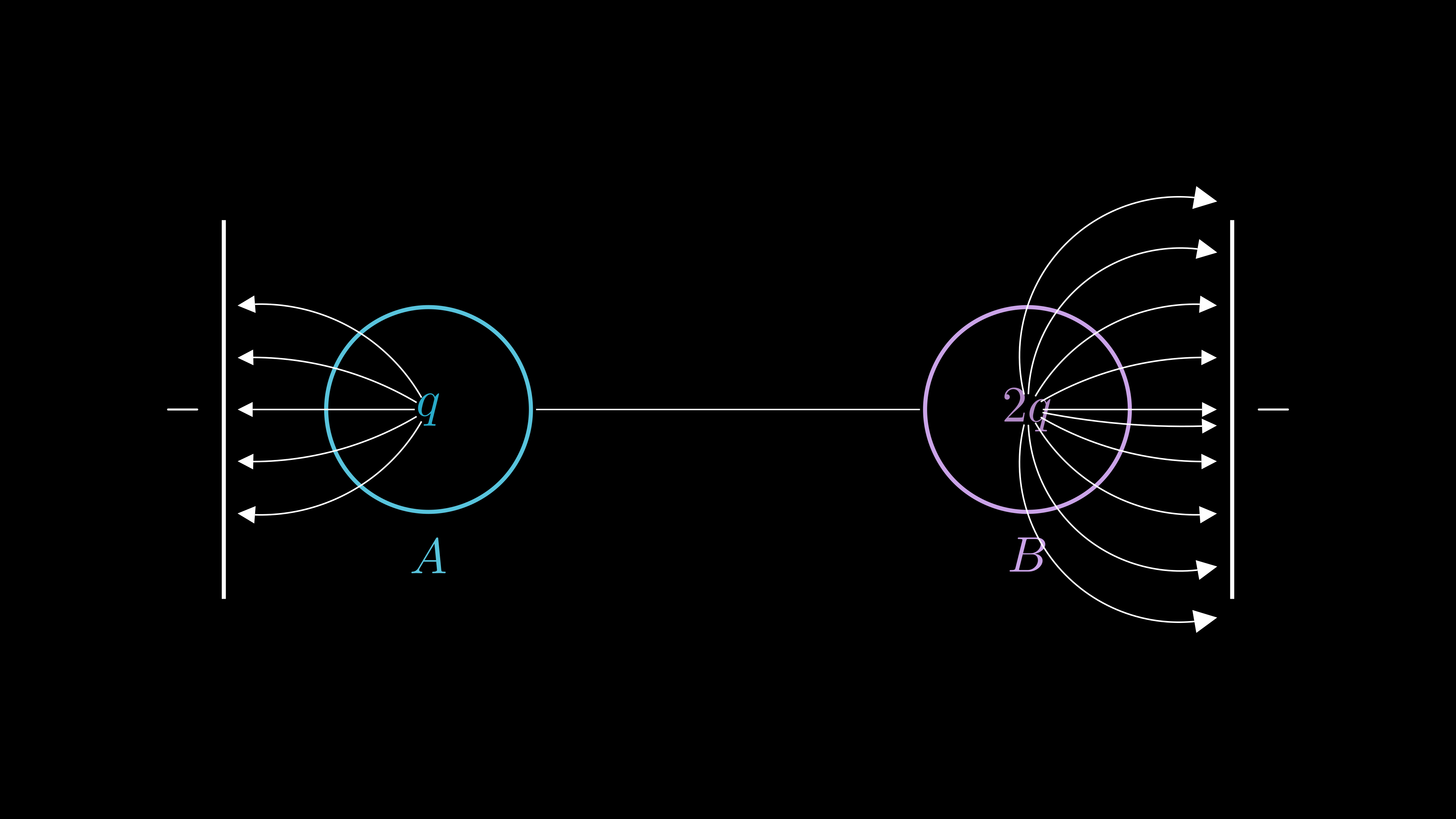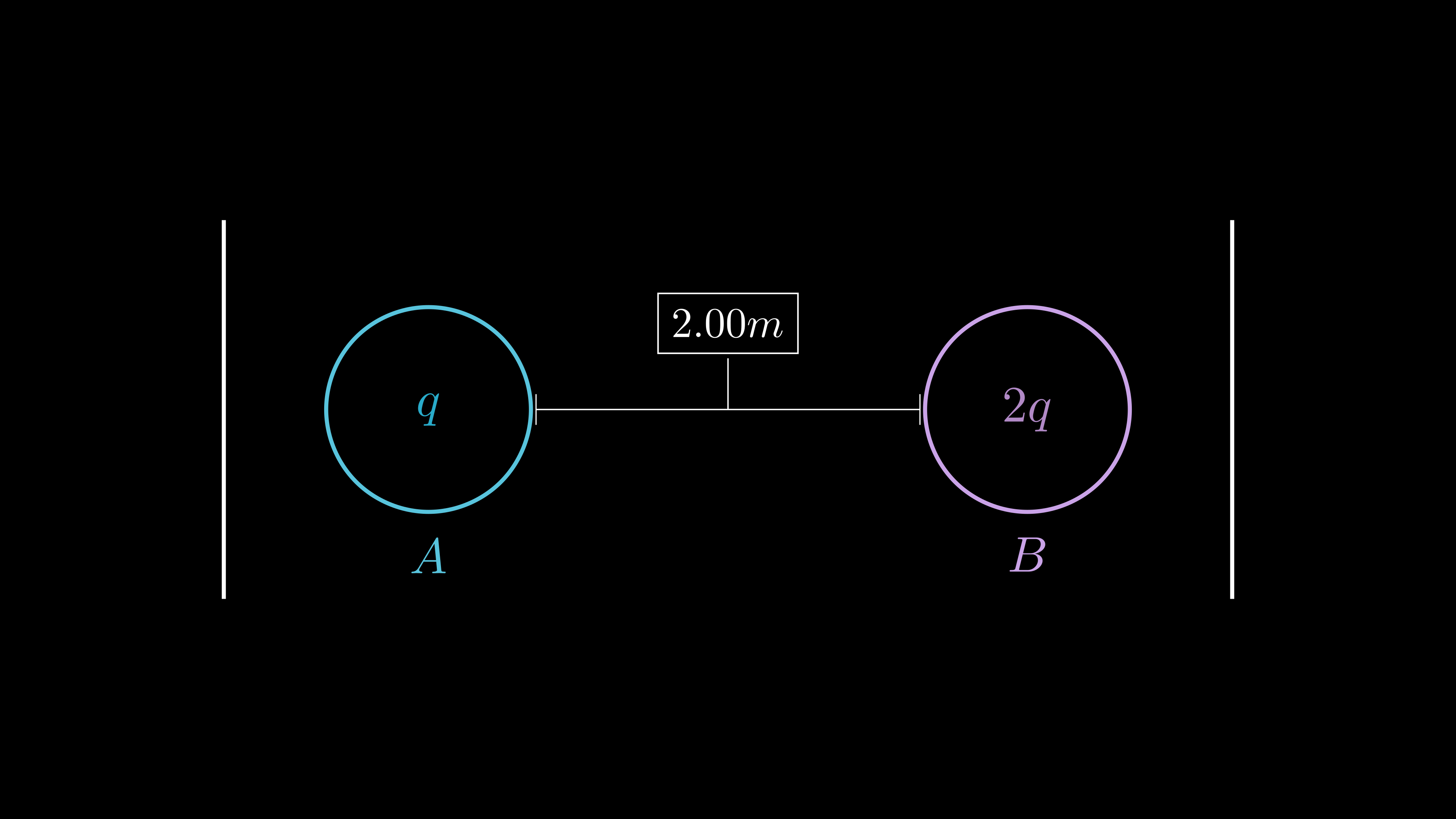 프리덤 우주정거장에 반지름을 무시할만한 두 개의 금속 구 A와 B가 두 개의 금속 칸막이 사이에서 떠서 정지해 있다. A와 B는 길이 2.00m의 팽팽한 비전도성 실에 의해 연결되어 있다. 구 A의 전하량은 q이고 구 B의 전하량은 2q이다. 각각의 금속 구는 칸막이와 1.00m 떨어져 있다.